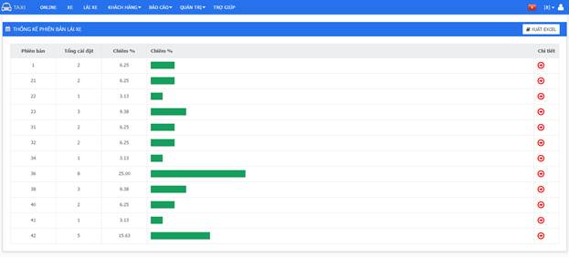 - Khi đó bảng thống kê chi tiết cuốc khách của lái xe theo ngày tìm kiếm được hiện ra như sau:
